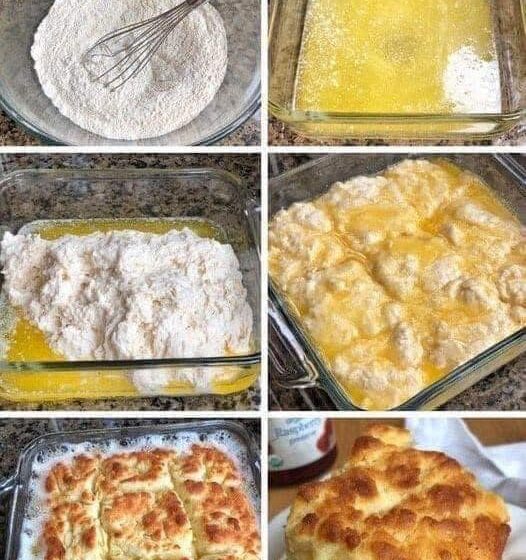 - Pour biscuit dough over the melted butter in the baking dish. Spread evenly—don’t worry if butter pools on top; that’s the magic.