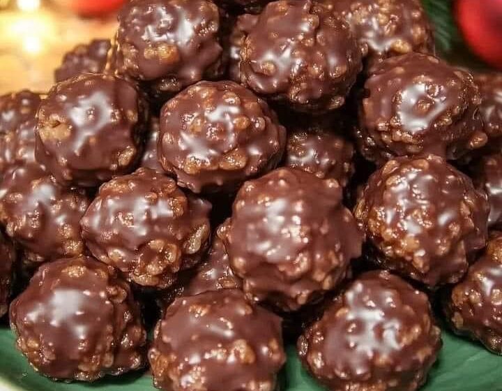 - Dip & coat: Roll each Rice Krispie ball into the melted chocolate until fully coated. Return to tray.