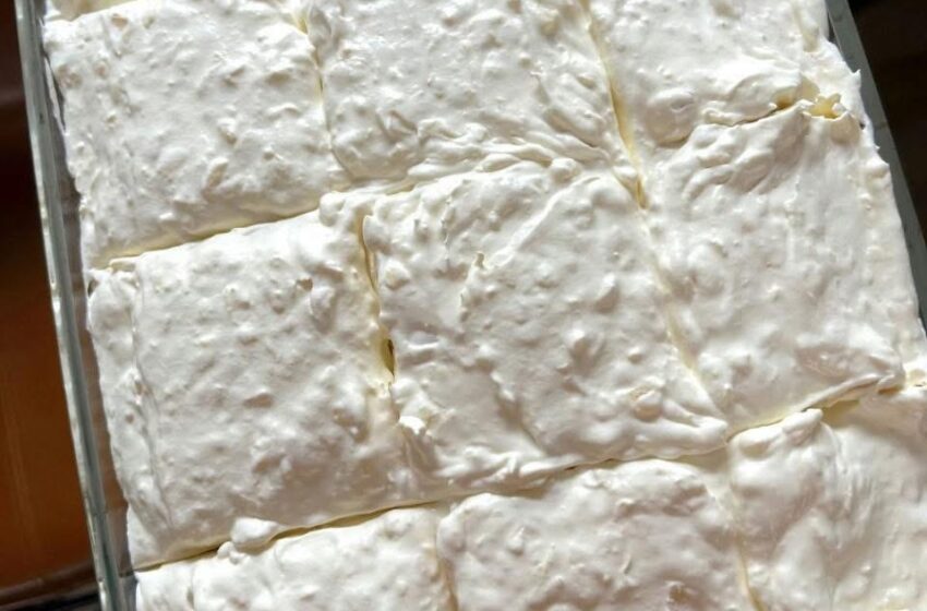 Slice into squares and serve chilled. This cake is fruity, creamy, and the perfect finish to a summer cookout.