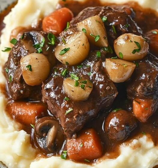 French Beef Bourguignon is a hearty and elegant dish from the Burgundy region of France. Tender chunks of beef are simmered slowly in red wine and beef broth, infused with garlic, herbs, mushrooms, and pearl onions. The result is a comforting yet refined stew, perfect for special occasions or a cozy family dinner.