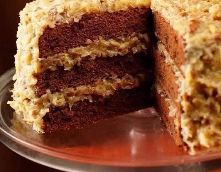 8. Once the cakes are baked and completely cooled, spread a layer of the coconut-pecan frosting on top of one cake layer.