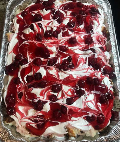 In a 13 * 9 baking dish, placing half of cake cubes in bottom of pan. Placing half a spoonful of cherry pie filling on top of cake.