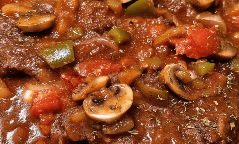 - Sauté Vegetables & Build Sauce: In the same pot, add the 1 diced onion, 1–2 diced celery stalks, 1 thinly sliced green bell pepper, and 8 oz of sliced mushrooms. Sauté until they begin to soften. Add the 2 minced garlic cloves and 3 tablespoons tomato paste, and cook for another 1–2 minutes until fragrant. Stir in the 1 (15 oz) can of diced tomatoes, 2 cups beef broth, 1 tablespoon Worcestershire sauce, ½ teaspoon dried thyme, 1 teaspoon sugar, and a pinch of celery seed if you are using it. Return the browned steaks to the pot, making sure they are submerged in the sauce.